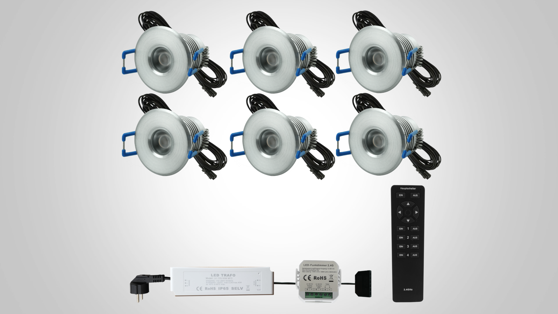 6er-Komplettset mit Trafo, Dimmer, Verbindungen, Verteiler, 4-Zonen Fernbedienung